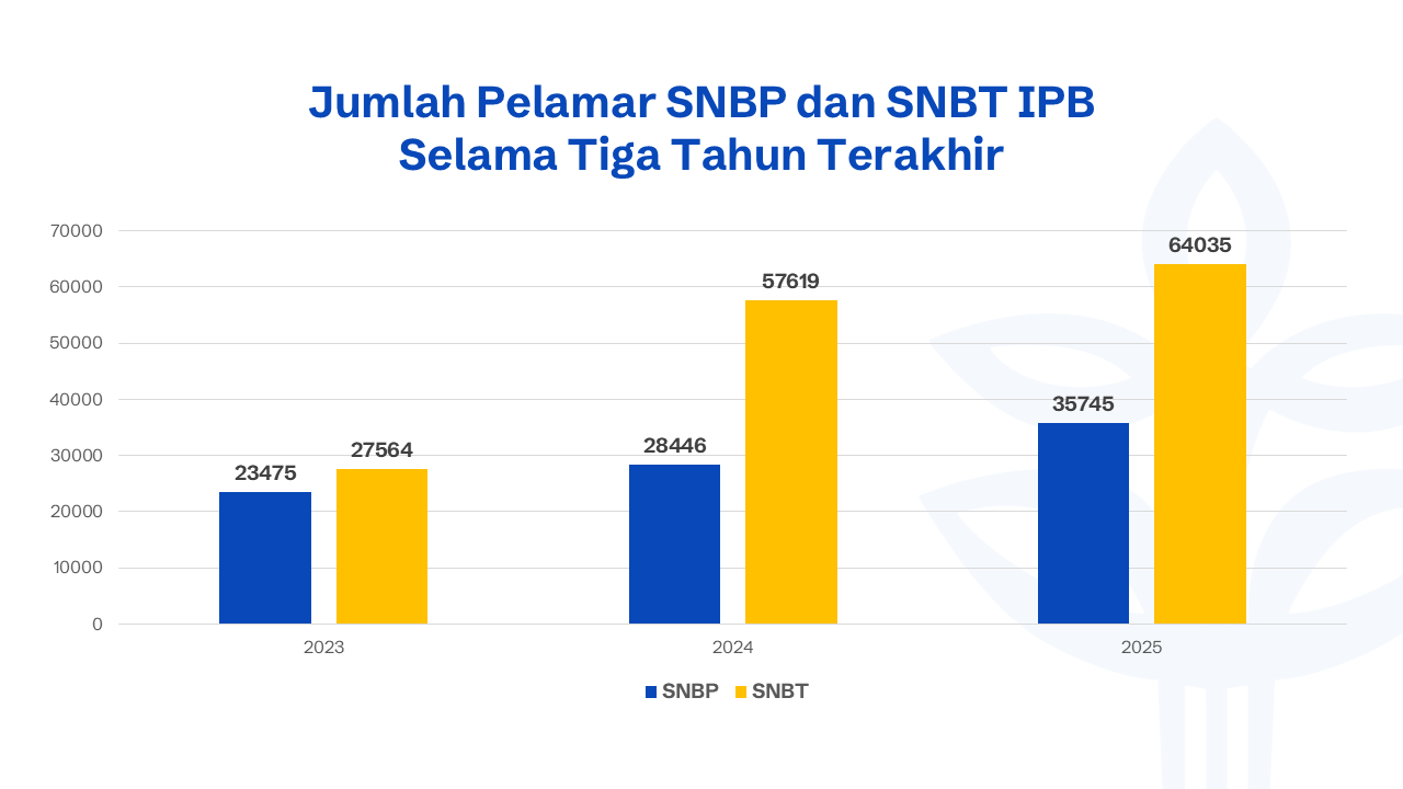 Antusiasme calon mahasiswa terhadap IPB University terus meningkat. Selama tiga tahun terakhir, jumlah pelamar di jalur Seleksi Nasional Berdasarkan Prestasi (SNBP) dan Seleksi Nasional Berdasarkan Tes (SNBT) mengalami peningkatan.