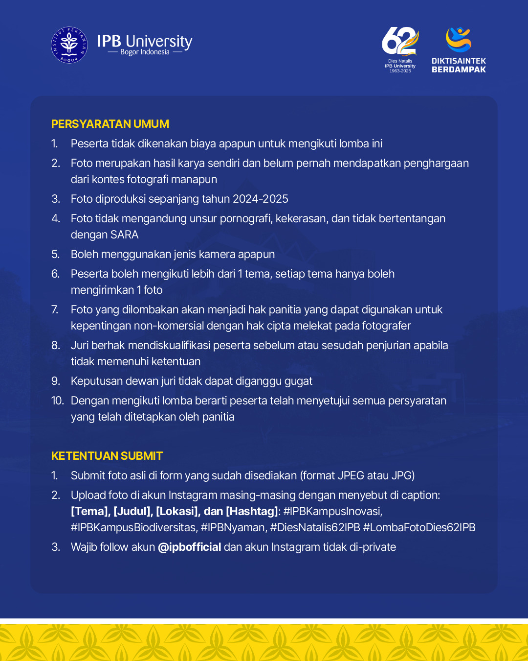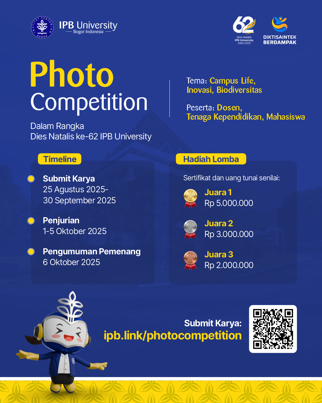 Kabar baik, karena masa pengumpulan karya Photo Competition dan Video Challenge Dies Natalis ke-62 IPB University resmi diperpanjang hingga 30 September 2025 🎉