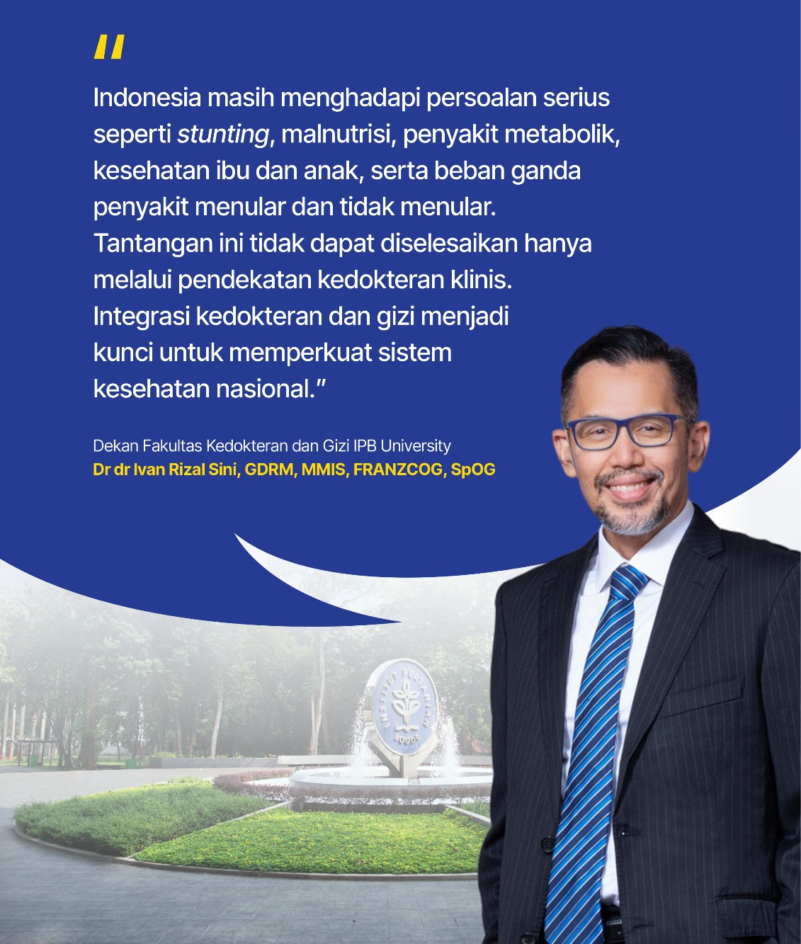 Rector of IPB University Dr Alim Setiawan Slamet stated that the integration of the Faculty of Medicine and the Department of Community Nutrition is a strategic move to strengthen the development of knowledge, education, and research in the fields of integrated health and nutrition, aligned with national and global challenges.