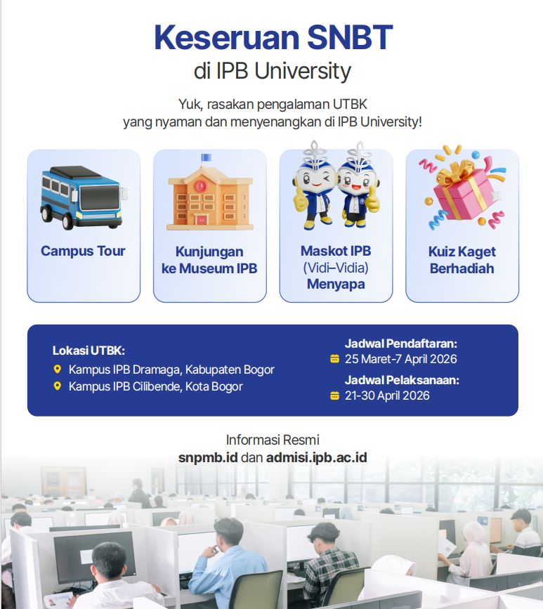 Registration for the UTBK-SNBT will begin on 25 March until 7 April 2026. The implementation will take place from 21 April to 30 April 2026. Complete information can be accessed at snpmb.id or admisi.ipb.ac.id.