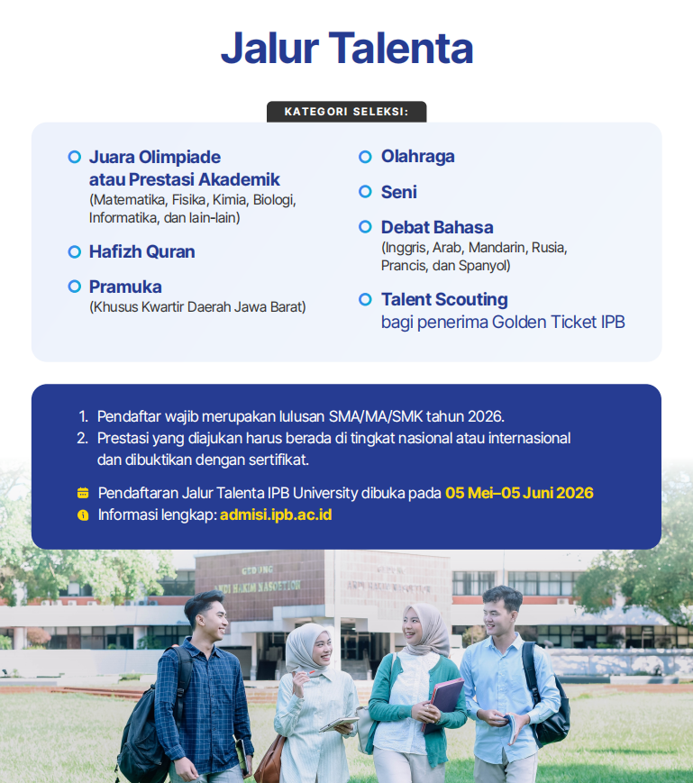 Registration for the IPB University Talent Pathway is open from 5 May to 5 June 2026. Complete information regarding requirements and registration procedures can be accessed through the official website admisi.ipb.ac.id.