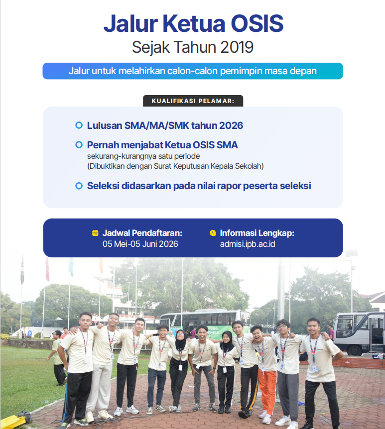 Registration for the IPB University Student Council President pathway is scheduled for 5 May to 5 June 2026. Further information is available at admisi.ipb.ac.id.