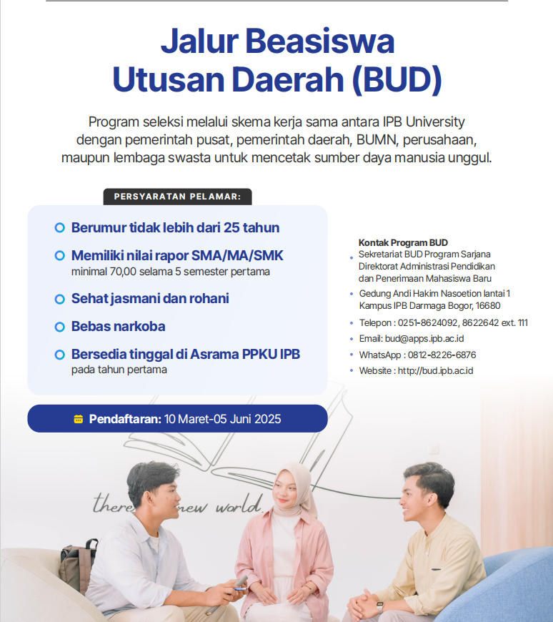 Unlike other pathways, BUD registration is conducted institutionally, meaning it is done through recommendations and funding from the proposing institution, not individually. The registration process is open from 10 March to 5 June 2026 and is conducted online via the website bud.admisi.ipb.ac.id.