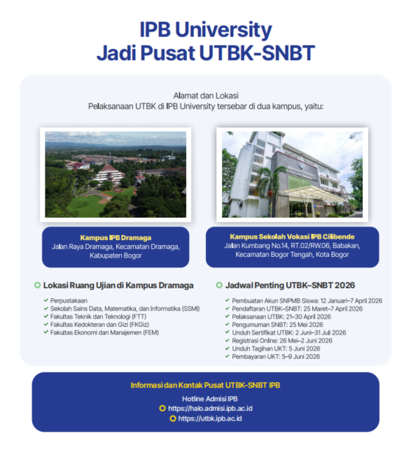 Sebagai informasi, IPB University memiliki beberapa kampus. Pada pelaksanaan UTBK tahun ini, ujian dipusatkan di dua lokasi, yaitu Kampus Dramaga dan Kampus Sekolah Vokasi IPB.