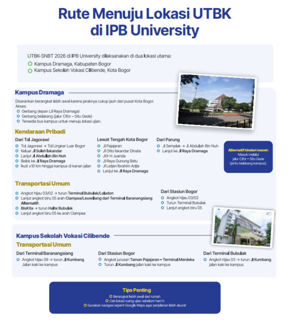 Bagi peserta yang belum familiar dengan lokasi IPB University, berikut panduan rute menuju lokasi UTBK, baik menggunakan kendaraan pribadi maupun transportasi umum.