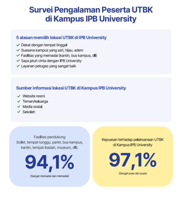 IPB University mencatat tingkat kepuasan tinggi dari peserta UTBK-SNBT 2025. Hasil survei menunjukkan bahwa 97,1 persen responden puas dan sangat puas terhadap pelaksanaan UTBK-SNBT di IPB University.